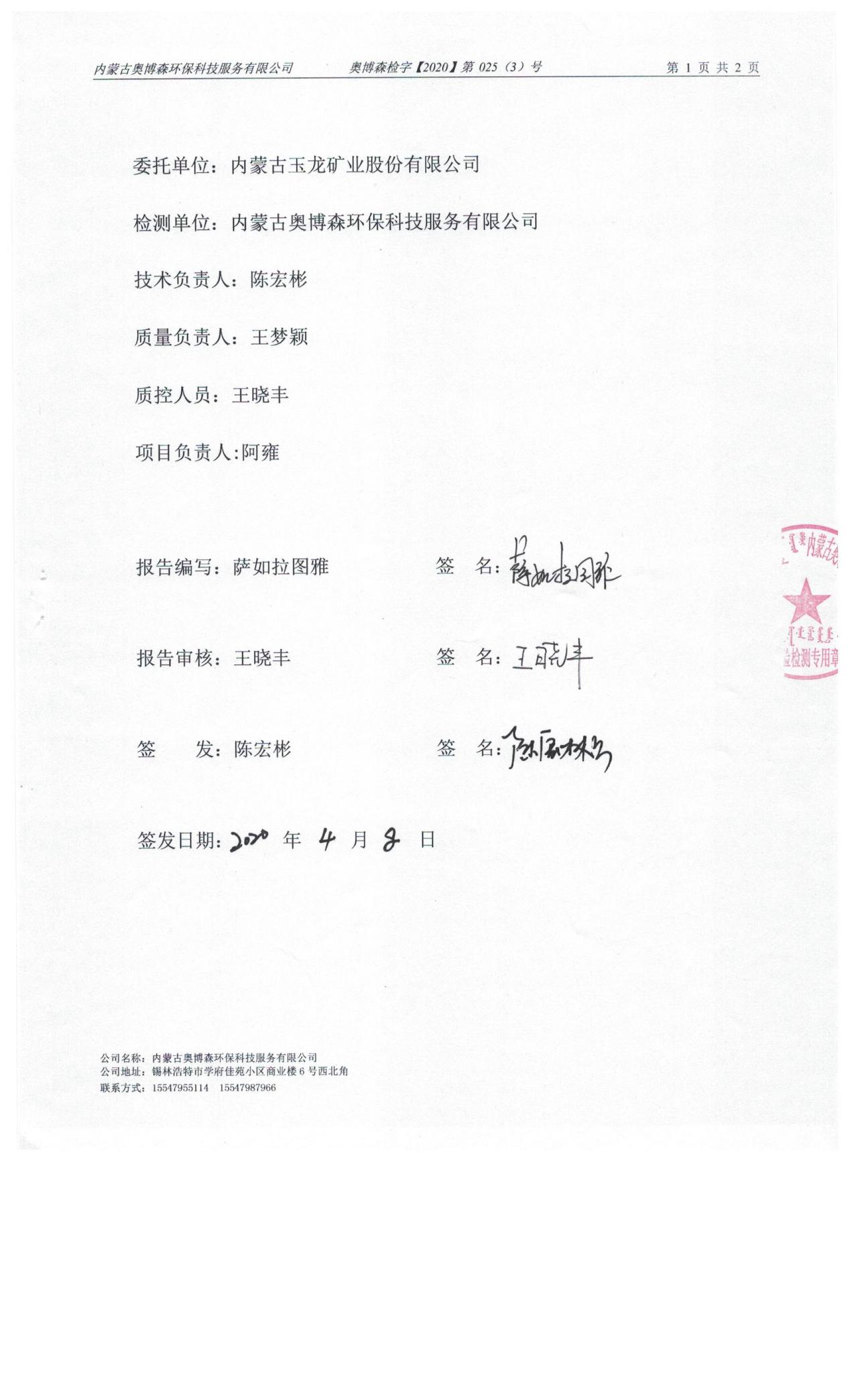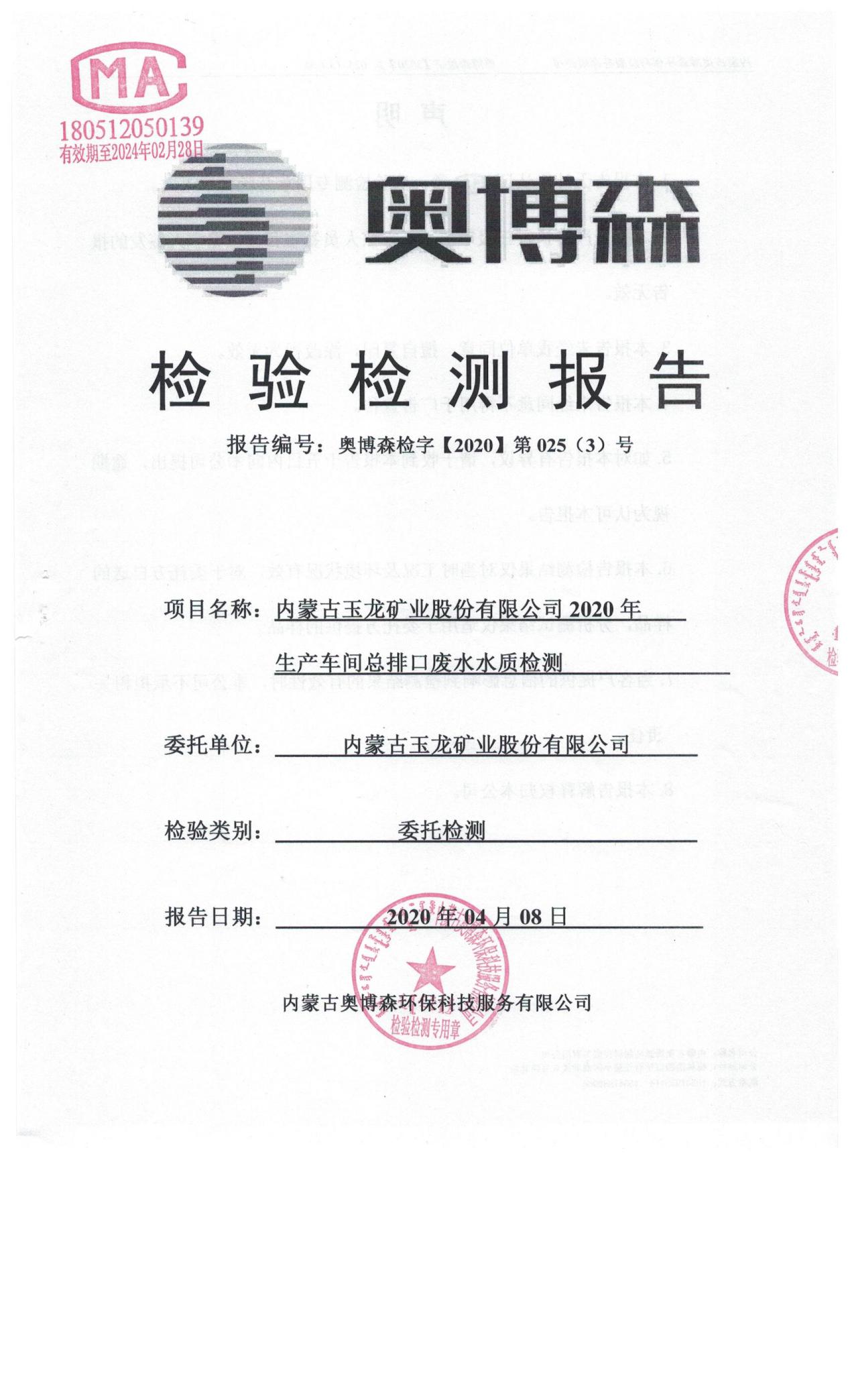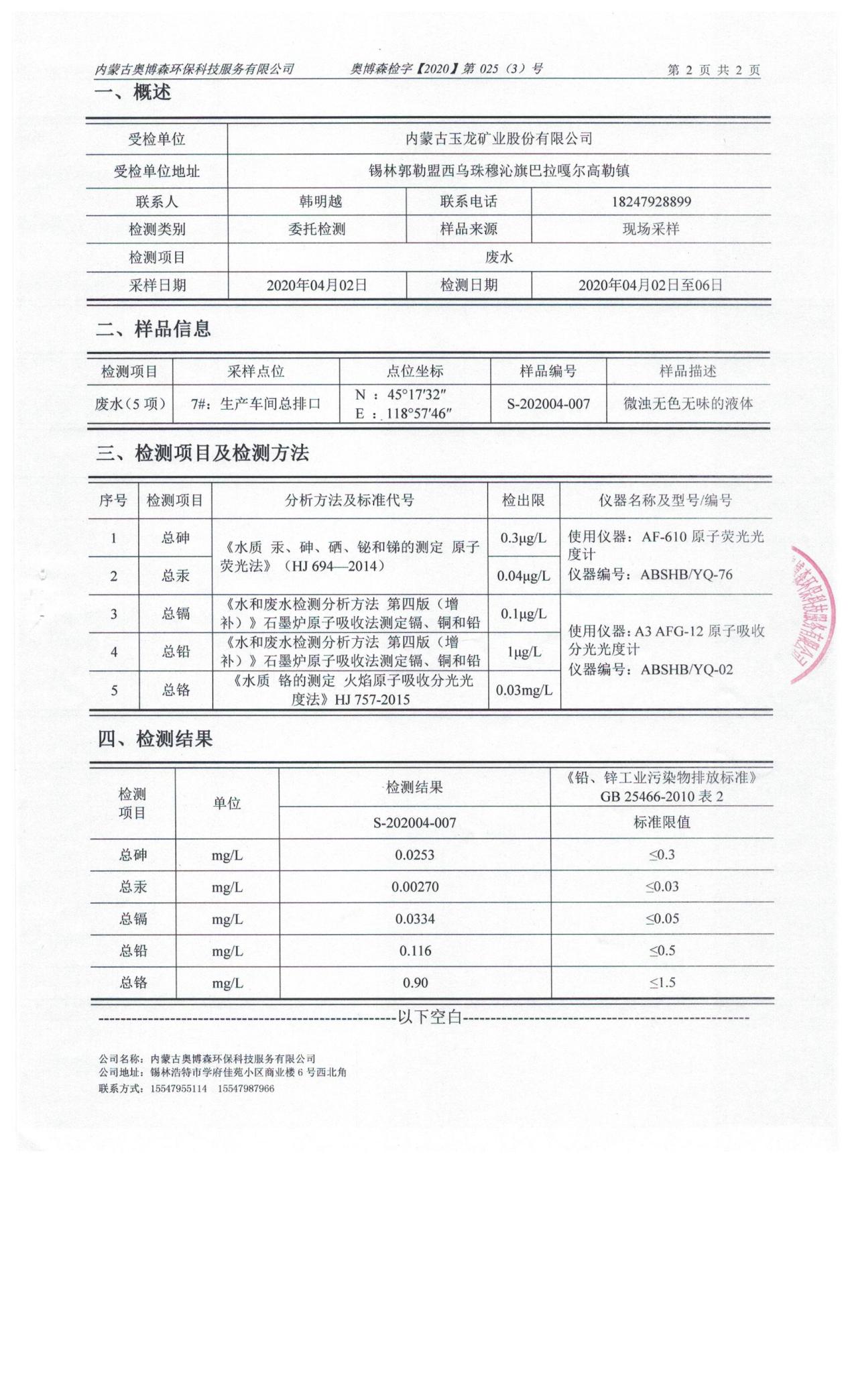 2020年4月份車間總排放口檢測報告